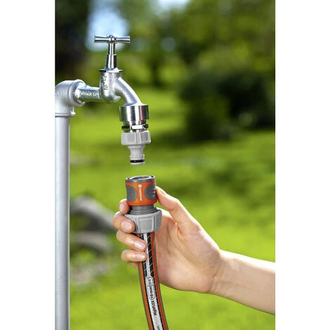 Das Set besteht aus einem Schlauchverbinder für den Anschluss am Schlauchanfang und einem Wasserstop für das Schlauchende. Die Zuordnung wird durch die Farbgebung erleichtert – heller Schlauchanfang und dunkles Schlauchende. Das Anschließen des Schlauchverbinders von GARDENA am Schlauchanfang geht schnell und einfach. Am Ende des Adapters findet sich der elastische Ring, der als Beschädigungsschutz dient. Die Anbringung des Schlauchsteckverbinders ist durch den Power Grip leicht zu handhaben. So verfügt das Zubehör über gerillte Griffmulden, die eine gelungene Haptik bieten. Selbst mit nassen Händen gelingt ein müheloser Anschluss. Außerdem ist der Schlauchadapter mit einer speziell geformten Überwurfmutter ausgestattet, die für eine hohe Schlauchhaltekraft sorgt. Mit dem Wasserstop bleibt beim Wechsel des Anschlussgerätes am Schlauchende der lästige Gang zum Wasserhahn erspart. Sobald ein Anschlussgerät wie zum Beispiel eine Spritzdüse entfernt wird, sorgt die Auto-Wasserstop-Funktion dafür, dass der Wasserdurchfluss sofort unterbrochen wird und erst dann wieder einsetzt, wenn ein neues Anschlussgerät mit dem Schlauch in Verbindung tritt. Da beide Teile sogar frostbeständig sind, können sie ganzjährig zum Einsatz kommen