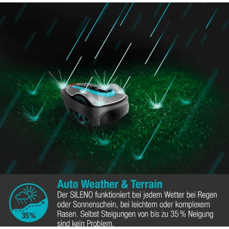The GARDENA robotic mower SILENO city 600 m² is a quiet, versatile, and intelligent Robotic Lawnmower with great connectivity, ideal for your smaller lawn. Using the GARDENA Bluetooth® App, you can use your smartphone to enter the lawn dimensions and mowing times, then you’re ready to go with no hassle. You can simply set up your SILENO city with EasyApp Control via Bluetooth® from up to 10 m away. The GARDENA Bluetooth® App aids you with a scheduling assistant to help you keep your garden just right. SILENO city knows how often to mow and how best to mow your lawn. The SILENO city is one of the quietest mowers on the market, with best in class low-noise levels at only 57db(A), you won’t disturb your neighbours. The CorridorCut system ensures that narrow spaces from 60 cm between the boundary wires and even dead ends are cut flawlessly. More precision is delivered with SensorControl, the robot judges for itself how often your lawn needs a trim, setting off at precisely the best frequency in line with grass growth. Your clever little helper will cut the grass as efficiently as possible. With Auto Weather and Terrain, the SILENO city will mow in all seasons, whatever the weather, even when it’s raining. Thanks to its frost sensor your robot mower notices if the ground is frozen and will halt its program until the ground has thawed. The boundary wire indicates to the SILENO city which part of the garden should be mowed. Similarly, the guide wire directs the robotic mower fully automatically around all mowing areas, through tight spaces, and finally back to the charging station. Slopes or inclines of up to 35 percent are no problem. The SILENO city can be cleaned easily with a garden hose. Lawn mowing is so easy with the SILENO city, just relax and let the robotic mower do the hard work for you. The GARDENA Bluetooth® App guides you intuitively step-by-step through installation. Your lawn will always look wonderfully well-manicured with the SILENO city from GARDENA.
